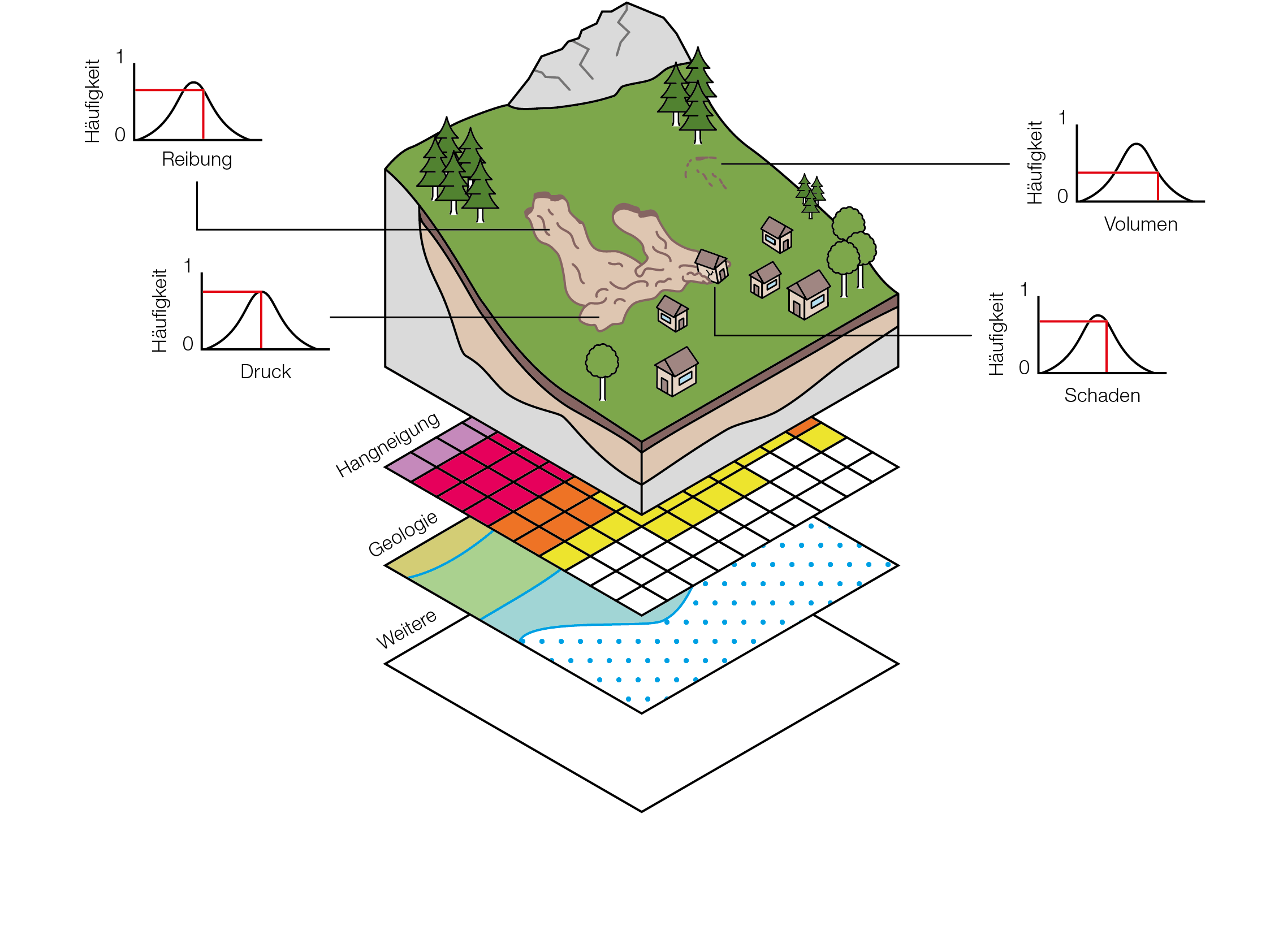 Die probabilistischen Modellierungen schaffen einheitliche Grundlagen, mit denen flexibel auf bisherige und neue Fragestellungen innerhalb des integralen Risikomanagements reagiert werden kann. Diese Grundlagen sind für alle gravitativen Naturgefahrenprozesse flächendeckend, von einheitlicher Qualität geplant und zeigen räumlich differenzierte Intensitäts-Frequenz-Kurven. Damit lässt sich die Charakteristik von Ereignissen erfassen, Unsicherheiten werden quantifiziert und die Basis für weitere Produkte und gutachterliche Beurteilungen wird geschaffen.